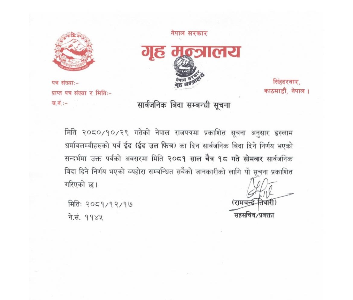 गृह मन्त्रालयका प्रवक्ता एवं सहसचिव रामचन्द्र तिवारीका अनुसार, २०८० माघ २९ को नेपाल राजपत्रमा प्रकाशित सूचनाअनुसार आज सार्वजनिक बिदा दिइएको हो ।