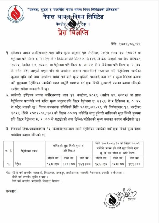 Sharesकाठमाडौँ : नेपाल आयल निगमले पेट्रोलको मूल्य घटाएको छ।