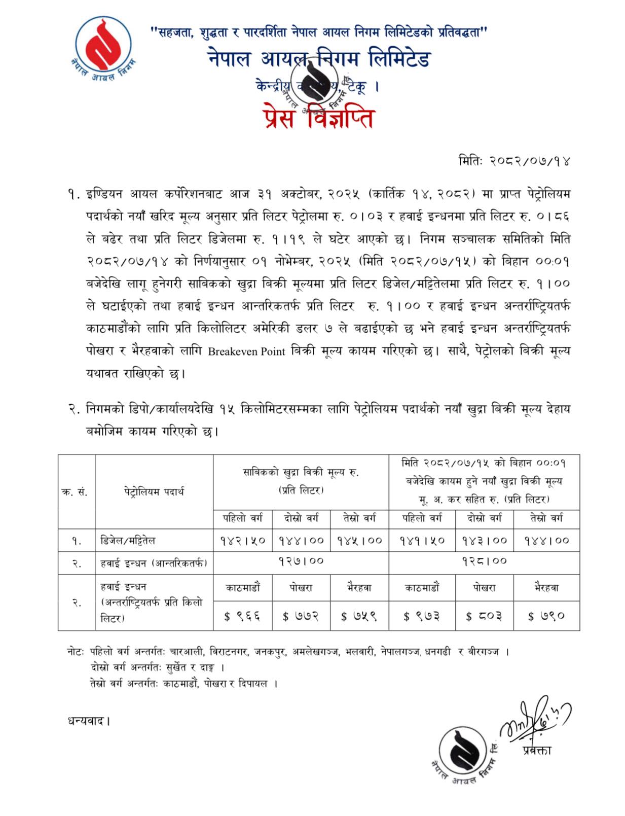 नेपाल आयल निगमले मध्यरातदेखि लागू हुने गरी डिजेल, मट्टीतेलको साविकको खुद्रा बिक्री मूल्यमा प्रतिलिटर एक रूपैयाँ घटाएको छ।