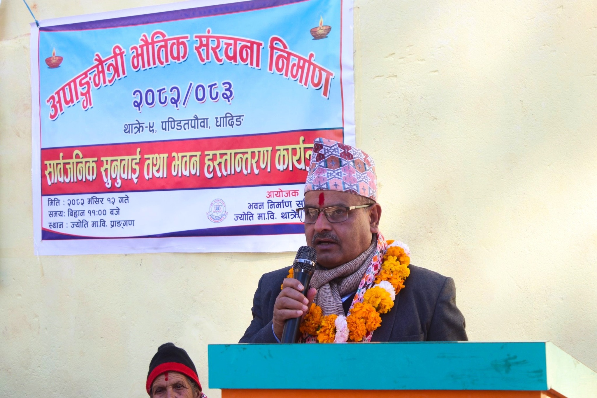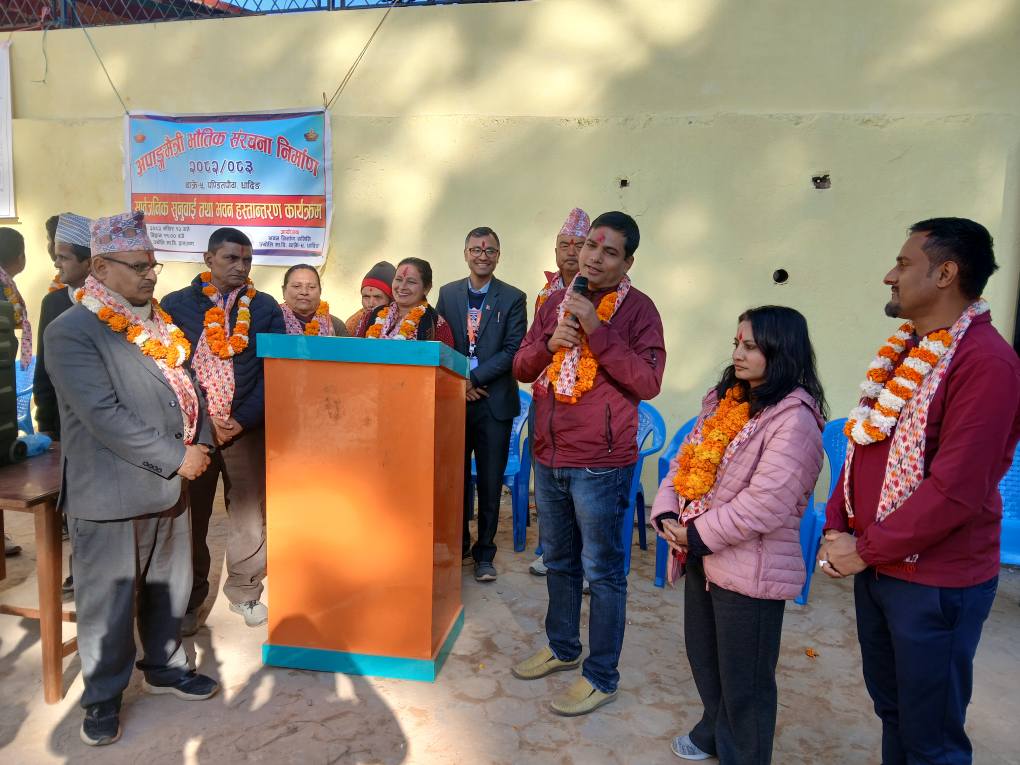ICDC नेपालका परियोजना प्रबन्धक विनोद रिजालले निर्माण सम्पन्न संरचनाले शिक्षालाई अगाडि बढाउन मद्दत गर्ने विश्वास व्यक्त गर्दै बाँकी रहेका कामहरू पूरा गर्न सहयोग गर्ने प्रतिबद्धता जनाउनु भयो ।
