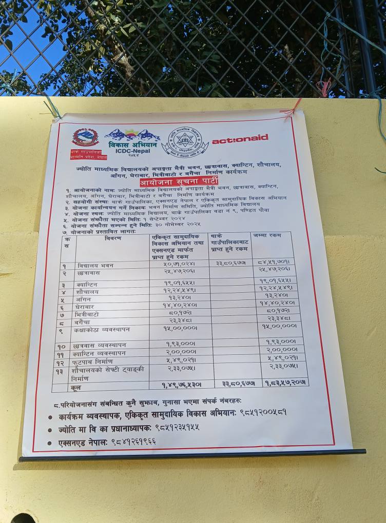 विद्यालयका प्रधानाध्यापक शाहदेव रेग्मीले विद्यालयमा भएका आय–व्ययको विवरण सार्वजनिक गर्दै केही काम अझै बाँकी रहेको उल्लेख गर्नु भयो । उहाले साझेदार संस्था तथा पालिकाको सहयोगमा बनेको संरचनाले विद्यालयका विद्यार्थीलाई सहज वातावरणमा अध्ययन गर्न मद्दत गर्ने विश्वास व्यक्त गर्नुभयो ।