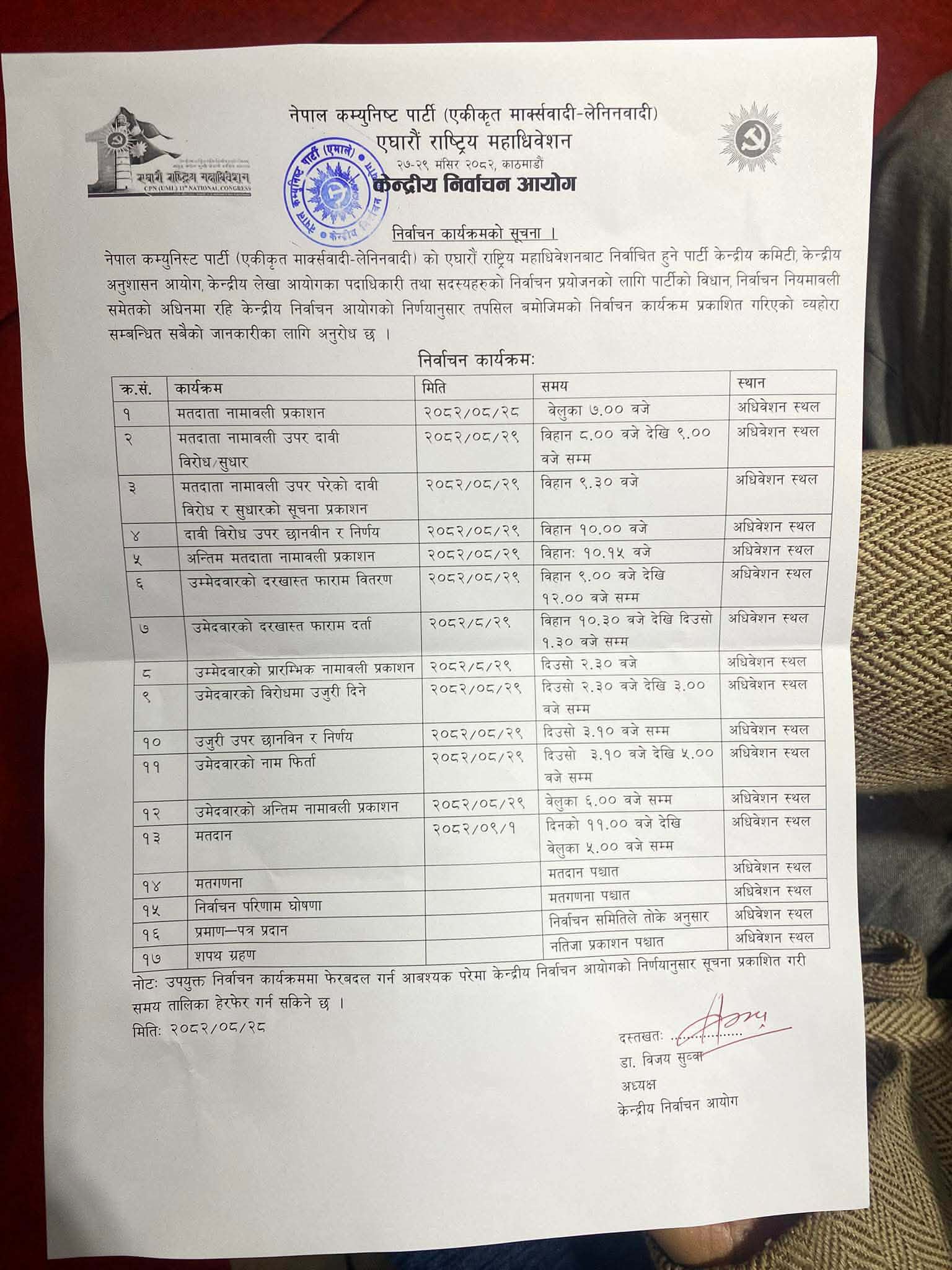एमालेमा नयाँ नेतृत्व चयनका लागि निर्वाचन तालिका प्रकाशन भइसकेको छ। आइतबार साँझ जारी कार्यतालिकाअनुसार सोमबार बिहान ८ बजेदेखि ९ बजेसम्म मतदाता नामावलीउपर दाबी विरोध र सुधारको सूचना प्रकाशन गरिनेछ।