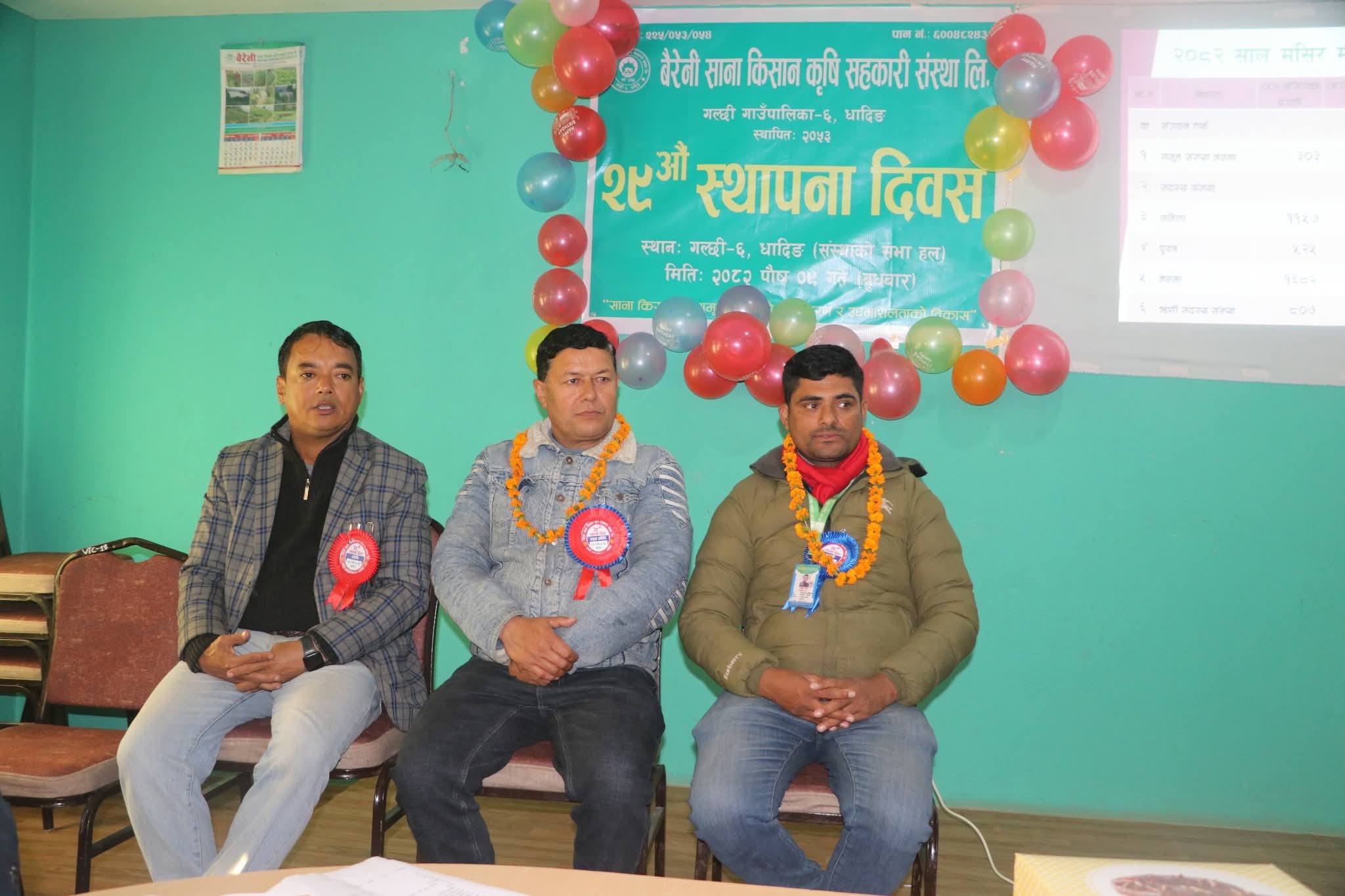 धादिङ : धादिङको गल्छी गाउँपालिका–६ मा अवस्थित बैरेनी साना किसान कृषि सहकारी संस्था लिमिटेडले आफ्नो २९ औँ स्थापना दिवस बुधबार विविध कार्यक्रमका साथ भव्य रूपमा मनाएको छ।
