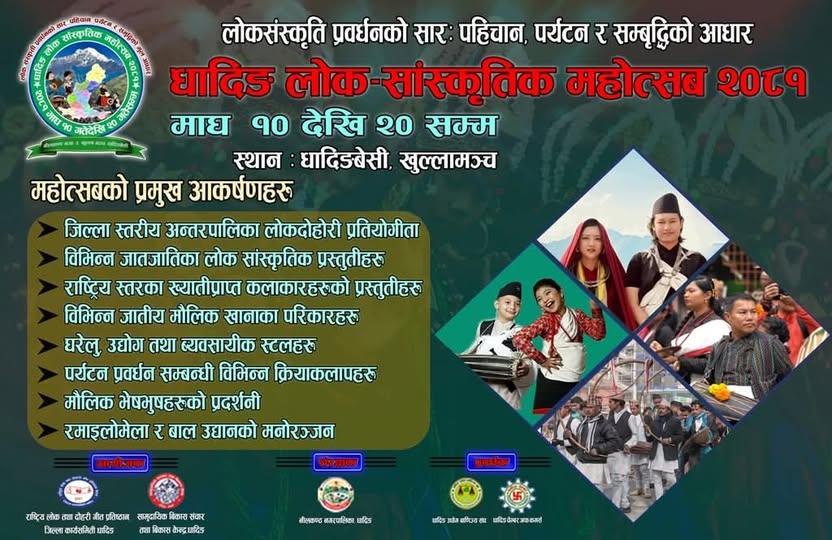 “धादिङको दीगो विकास र अर्थतन्त्रको आधार : कृषि, पर्यटन, जलस्रोत तथा उद्योगको पूर्वाधार” भन्ने मूल नारासहित आयोजना हुन लागेको महोत्सवको औपचारिक उद्घाटन माघ १५ गते बिहान ११ बजे धादिङबेसीस्थित नीलकण्ठ नगरपालिका–३ मा हुनेछ।