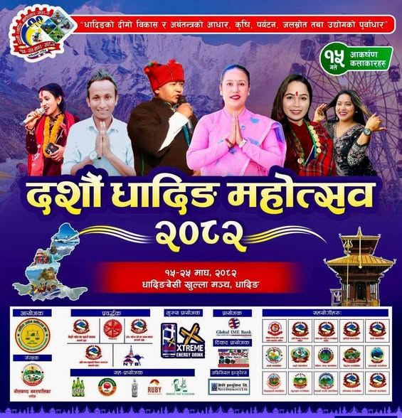 धादिङ: “धादिङको दीगो विकास र अर्थतन्त्रको आधार, कृषि, पर्यटन, जलस्रोत तथा उद्योगको पूर्वाधार” भन्ने मूल नाराका साथ दशौँ धादिङ महोत्सव–२०८२ आजदेखि धादिङबेसीमा सुरु हुँदैछ। स्थानीय उत्पादनको प्रवर्द्धन, कृषि तथा पर्यटन विकासमा टेवा पुर्याउने उद्देश्यका साथ आयोजना गरिएको यो महोत्सव आज औपचारिक रूपमा उद्घाटन गरिँदैछ।