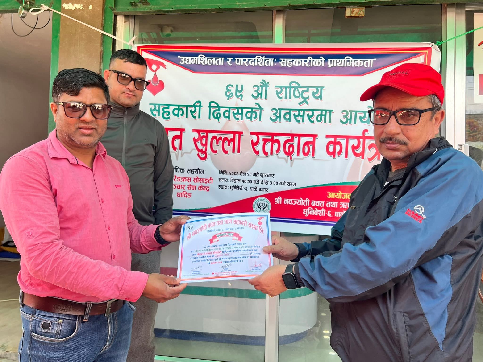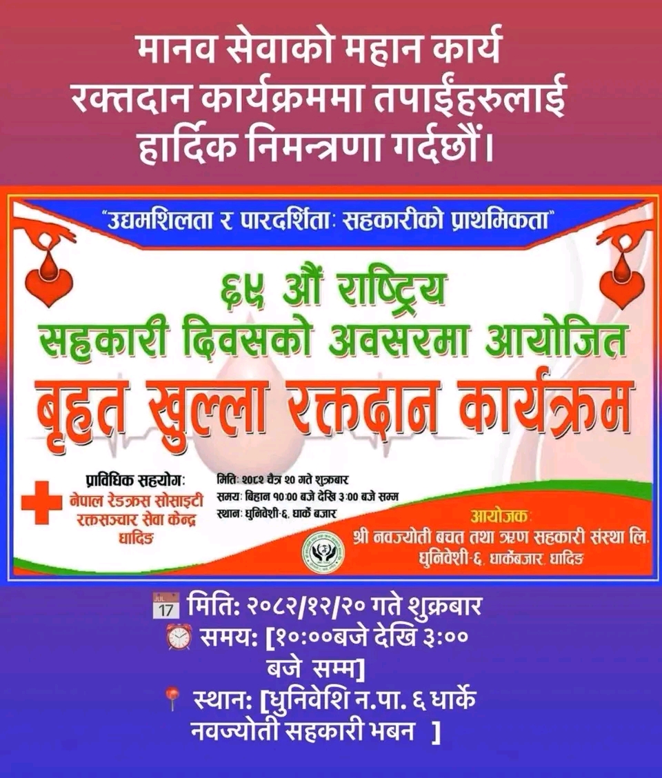 धादिङ : ६९औँ राष्ट्रिय सहकारी दिवस २०८२ को अवसर पारेर नवज्योति बचत तथा ऋण सहकारी संस्था लिमिटेडको आयोजनामा रक्तदान कार्यक्रम सम्पन्न भएको छ।