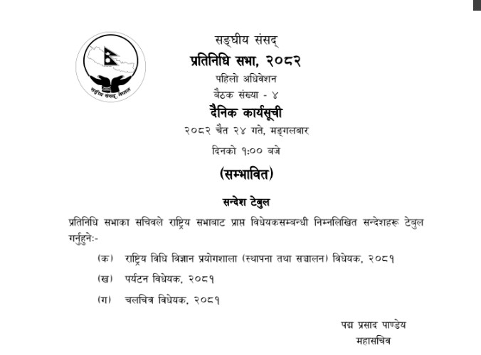 आजको बैठकमा ‘राष्ट्रिय विधि विज्ञान प्रयोगशाला (स्थापना तथा सञ्चालन) विधेयक, २०८१’, ‘पर्यटन विधेयक, २०८१’ र ‘चलचित्र विधेयक, २०८१’ प्रस्तुत गर्ने सम्भावित कार्यसूची रहेको छ। हेर्नुहोस तालिका