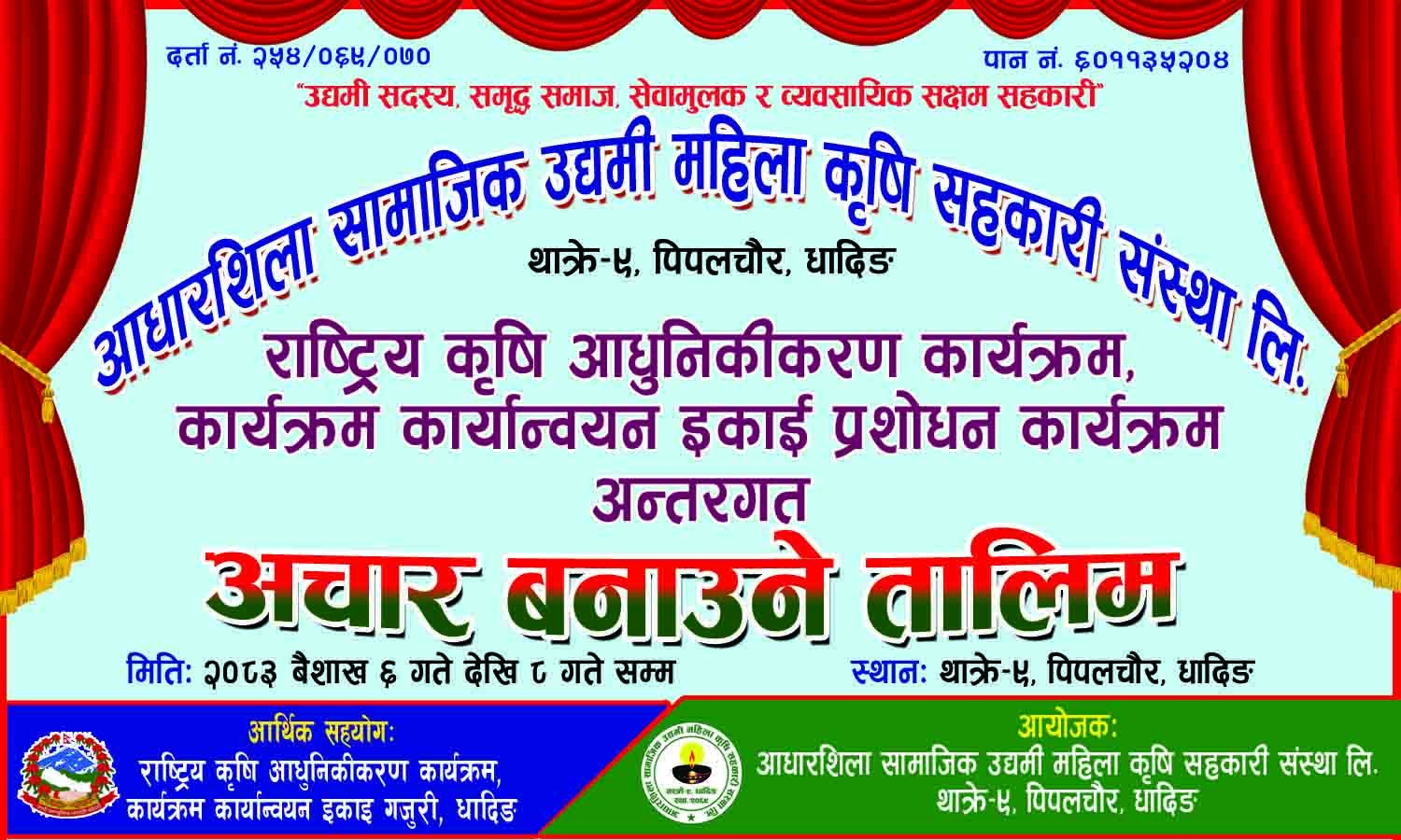 थाक्रे: धादिङको थाक्रे गाउँपालिका–९ पिपलचौरमा रहेको आधारशिला सामाजिक उद्यमी महिला कृषि सहकारी संस्था लि.ले अचार बनाउने तालिम सुरु गरेको छ।